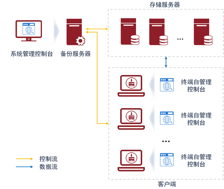 存儲服務器:負責存儲備份數據,可部署一臺或多臺存儲服務器,也可以與備份服務器部署在同一設備上。