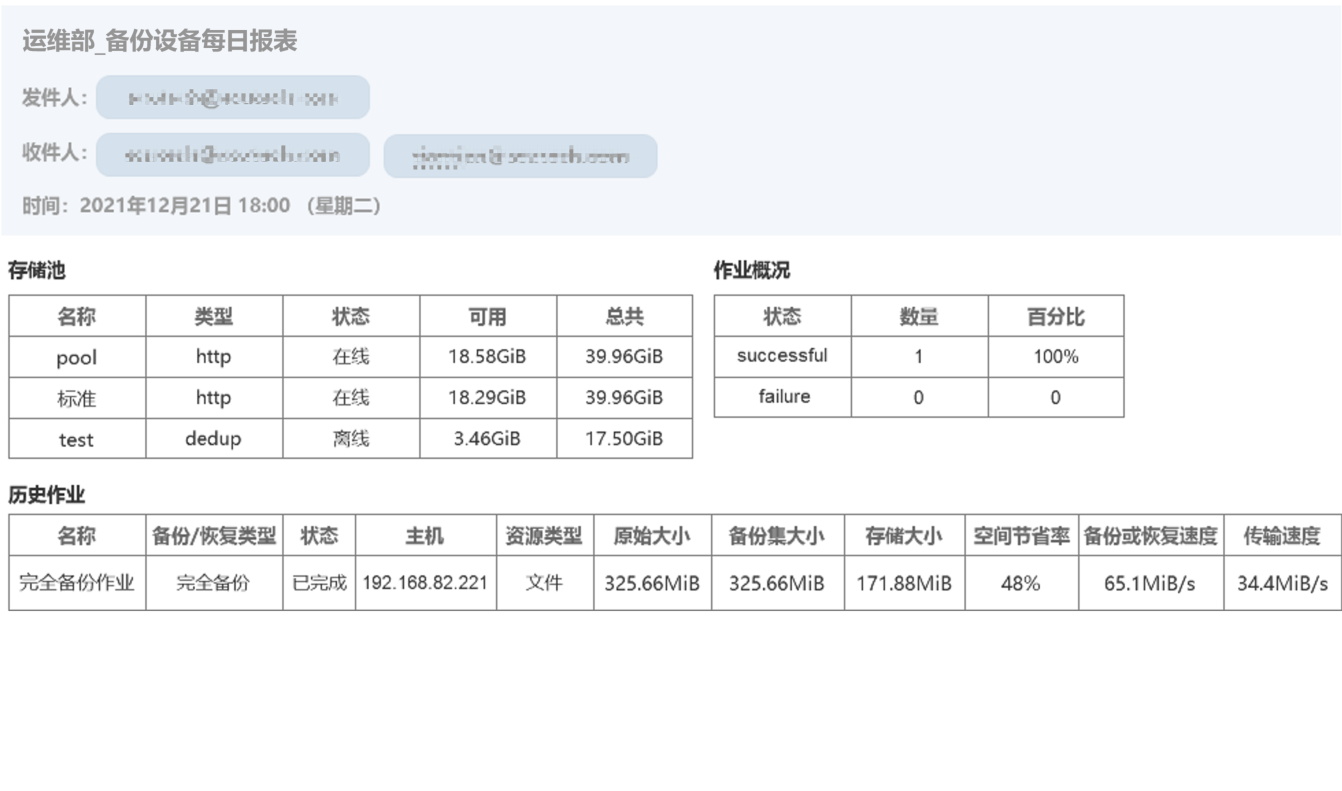 自動發(fā)送運維郵件是系統(tǒng)每天自動生成一份關(guān)于作業(yè)概覽、存儲池狀況、歷史作業(yè)等數(shù)據(jù)的運維報表,每天定時自動發(fā)送到單位各部門指定郵箱,向各部門反饋即時運維情況,有利于運維人員全面掌握備份作業(yè)、資源運維狀況等,確保備份恢復(fù)運維工作有條不紊進行。