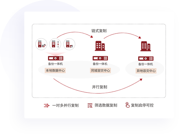 DBackup 為適應(yīng)多種容災(zāi)場景,新增支持存儲池的一對多并行復(fù)制,可直接將本地數(shù)據(jù)中心的數(shù)據(jù)并行復(fù)制到多個容災(zāi)中心,當(dāng)本地數(shù)據(jù)中心出現(xiàn)故障時可指定同城或者異地容災(zāi)中心進(jìn)行數(shù)據(jù)的快速恢復(fù),豐富了異地容災(zāi)的多樣性和可靠性!用戶還可按資源、備份類型篩選出核心數(shù)據(jù)進(jìn)行復(fù)制,減少不必要的存儲和帶寬成本,從而提升池復(fù)制的時效性,幫助用戶更高效安全地搭建兩地三中心方案!