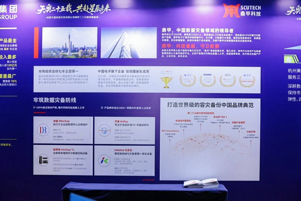 在慶典展區,鼎甲攜手天奧展示了雙方在數據保護領域的合作歷程與成果。從創新產品到成功案例,從聯合方案到客戶實踐,鼎甲與天奧的合作印證了“共創、共建、共贏”的價值理念。現場嘉賓紛紛駐足交流,對鼎甲在數據安全與合規領域的技術實力與服務能力表示認可。