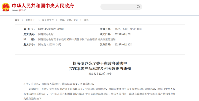2025年9月30日,國(guó)務(wù)院辦公廳印發(fā)《關(guān)于在政府采購(gòu)中實(shí)施本國(guó)產(chǎn)品標(biāo)準(zhǔn)及相關(guān)政策的通知》(國(guó)辦發(fā)〔2025〕34號(hào)),自2026年1月1日起正式施行。