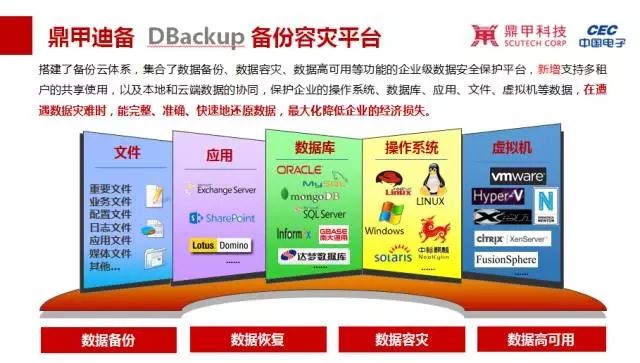 鼎甲迪備( DBackup )搭建了備份云體系,集合了數(shù)據(jù)備份、數(shù)據(jù)容災、數(shù)據(jù)高可用等功能的企業(yè)級數(shù)據(jù)安全保護平臺,支持多租戶的共享使用,以及本地和云端數(shù)據(jù)的協(xié)同,保護企業(yè)的操作系統(tǒng)、數(shù)據(jù)庫、應用、文件、虛擬機等數(shù)據(jù),在遭遇數(shù)據(jù)災難時,能完整、準確、快速地還原數(shù)據(jù),最大化降低企業(yè)的經(jīng)濟損失。