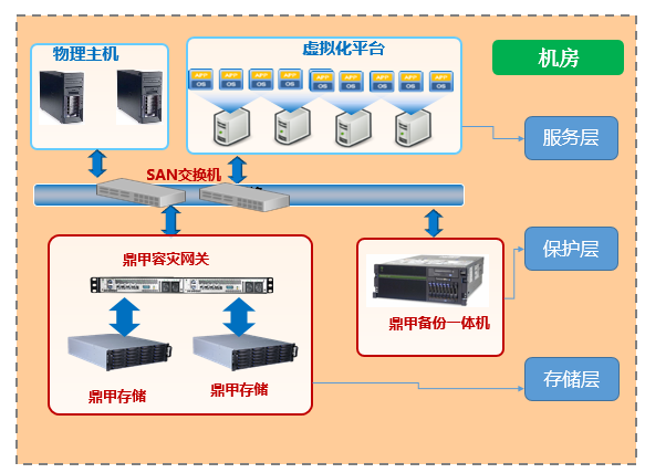 存儲設(shè)備、容災(zāi)網(wǎng)關(guān)、備份一體機(jī)均采用鼎甲的產(chǎn)品,完美融合,可以最大限度的提高性能。