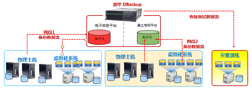針對(duì)電子政務(wù)與國(guó)土專網(wǎng)兩大平臺(tái),采用鼎甲DBackup平臺(tái),進(jìn)行備份存儲(chǔ)池的隔離。最終實(shí)現(xiàn)兩大業(yè)務(wù)平臺(tái),一套數(shù)據(jù)保護(hù)系統(tǒng)的方案架構(gòu)。利用迪備軟件的高并發(fā)多通道的技術(shù),將原有生產(chǎn)主機(jī)的數(shù)據(jù)備份時(shí)間由原來的5小時(shí)縮短至1小時(shí),減輕了對(duì)生產(chǎn)主機(jī)備份帶來影響。為了驗(yàn)證數(shù)據(jù)可靠性,所有集中保護(hù)數(shù)據(jù)通過災(zāi)難恢復(fù)演練平臺(tái)自動(dòng)驗(yàn)證,確保數(shù)據(jù)始終正確可用,獲得好評(píng)。