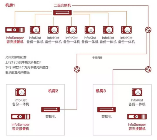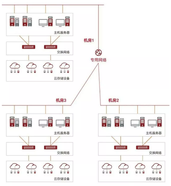 鑒于該項目涉及3大數據中心機房,因此從網絡架構設計的角度,無論是本地的數據備份,還是跨數據中心的數據復制,都需要以萬兆為核心的網絡構建,實現跨運營商的統一管理和數據存儲隔離。其中,數據備份首先存放在本地容災設備,再增量同步到跨機房的遠端冗余的容災設備(參加下圖)。