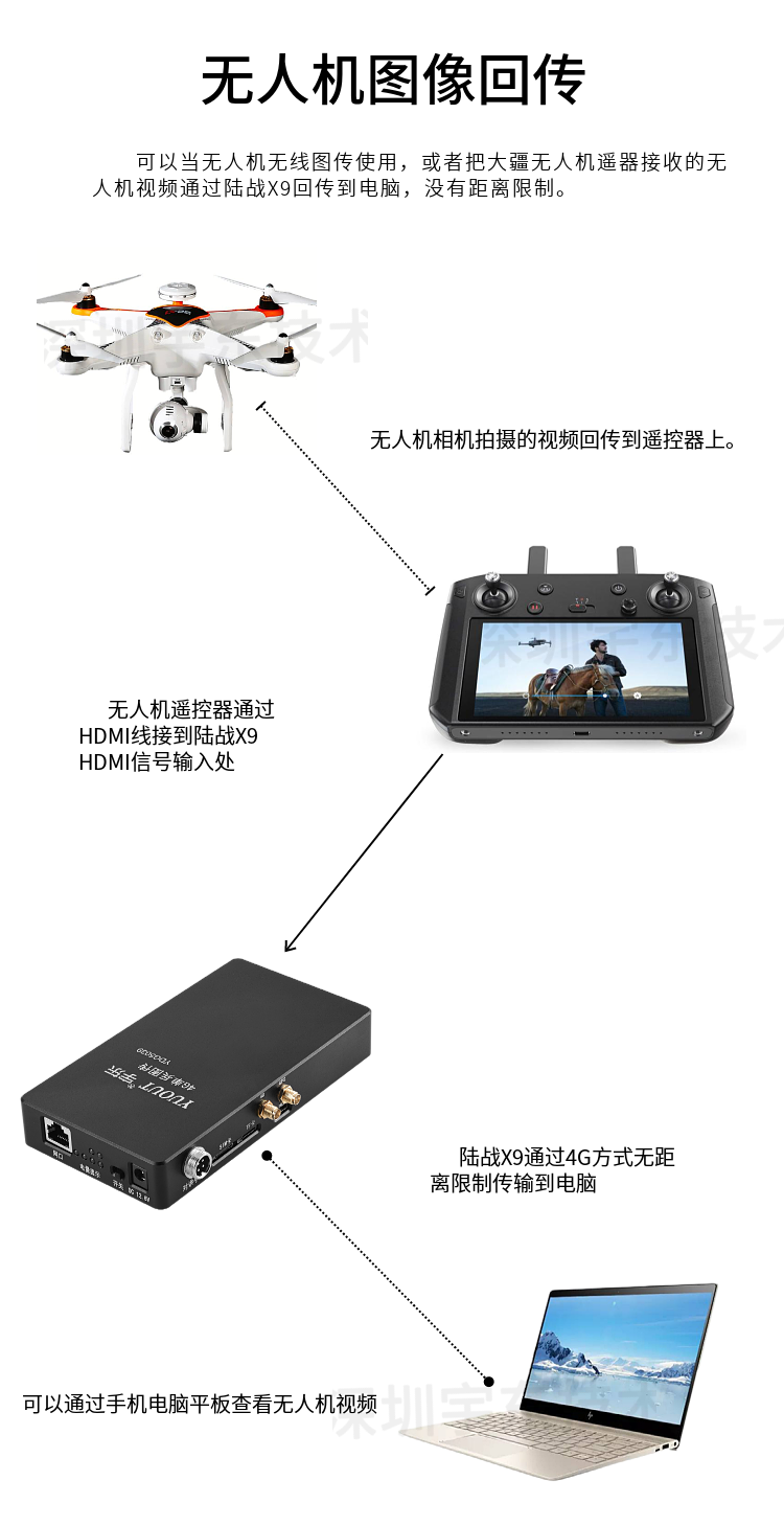1、把無(wú)人機(jī)遙控器接收到的無(wú)人機(jī)空中畫(huà)面,通過(guò)HDMI線(xiàn),接到陸戰(zhàn)X9 HDMI輸入接口,可以把空中無(wú)人機(jī)拍攝的視頻通過(guò)4G,沒(méi)有距離限制的傳輸?shù)叫枰O(jiān)看地方。