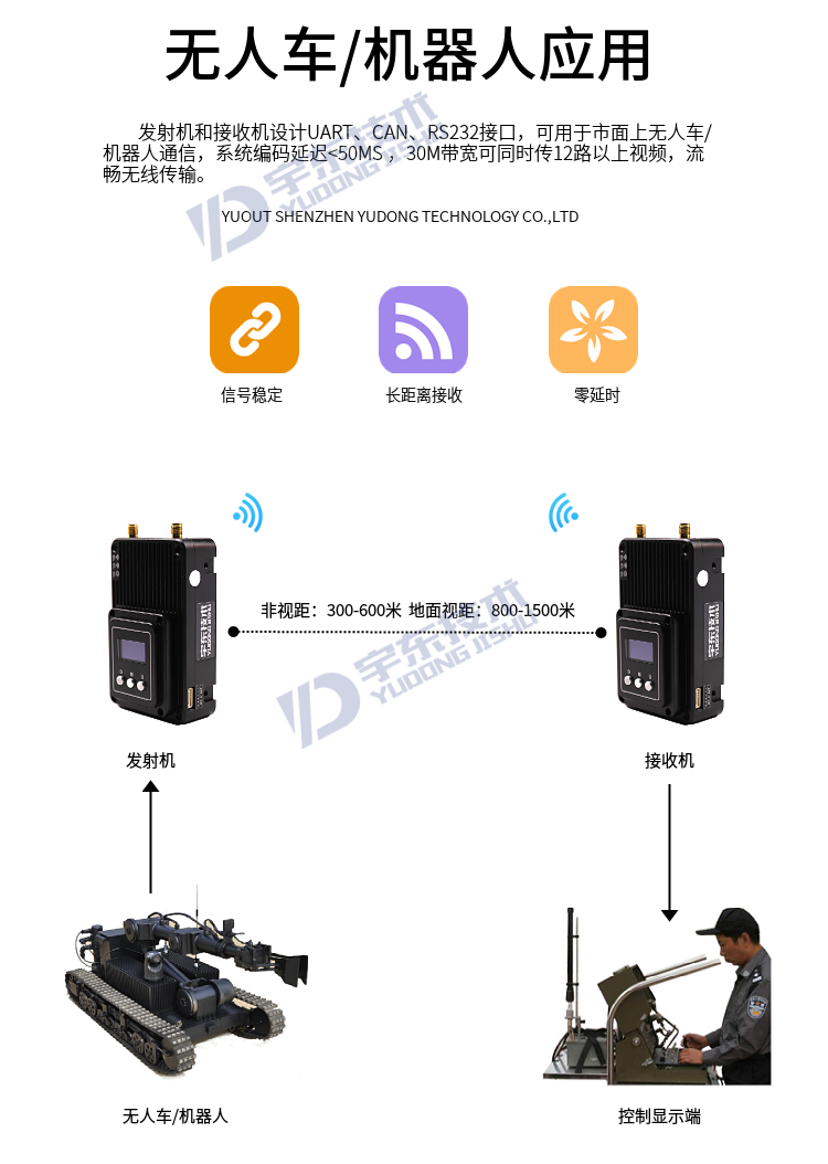 YDTD8000宇東視頻數(shù)據(jù)無線圖傳系統(tǒng)采用工業(yè)級無線高速率數(shù)據(jù)傳輸技術(shù),非視距,非WIFI,集合正交頻分復(fù)用時分多址調(diào)制及MIMO多進(jìn)多出容量技術(shù),完全基于IP互聯(lián)網(wǎng)協(xié)議,實現(xiàn)全雙向透明通道傳輸。非視距:300-600米;地面視距:800-1500米;空對地:5000米。系統(tǒng)為純硬件連接,即插即用;創(chuàng)新性液晶一體化設(shè)計、豐富的CAN總線、RS-232、TTL電平接口,更好的用戶角度體驗。通道最大支持30Mbps吞吐量,可廣泛應(yīng)用于工業(yè)自動化、工業(yè)機器人、無人機、視頻監(jiān)控等通信工作。
