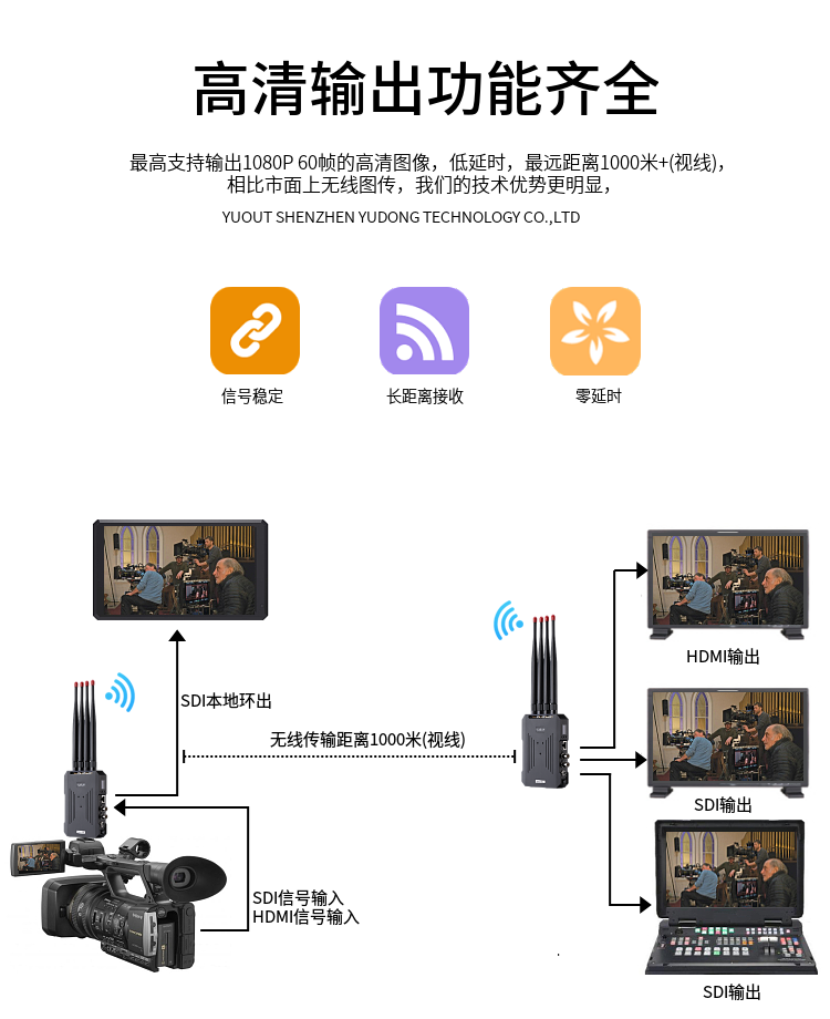 YD-TQ1000-DS是由發射端和接收端組成,支持3G/HD/SD-SDI或者HDMI 1080P全高清信號傳輸,作為圖傳時,視線無阻擋傳輸距離1000至1500米。頻段采用5.1-5.8GHz,支持用戶手動通信頻點調整,為發射端和接收端配對,還支持廣播模式,可以把多個接收端設置成跟一個發射端相同的頻點,實現一發多收。純硬件連接操作,簡單可靠。設計精巧,可以F970 、V口、 電源適配器三種供電方式,方便移動拍攝。廣泛應用于電影拍攝、應急搶險、消防、人防、武警、突發事故單兵視頻采集等場合;真正實現高清無線傳輸、移動實時傳輸、