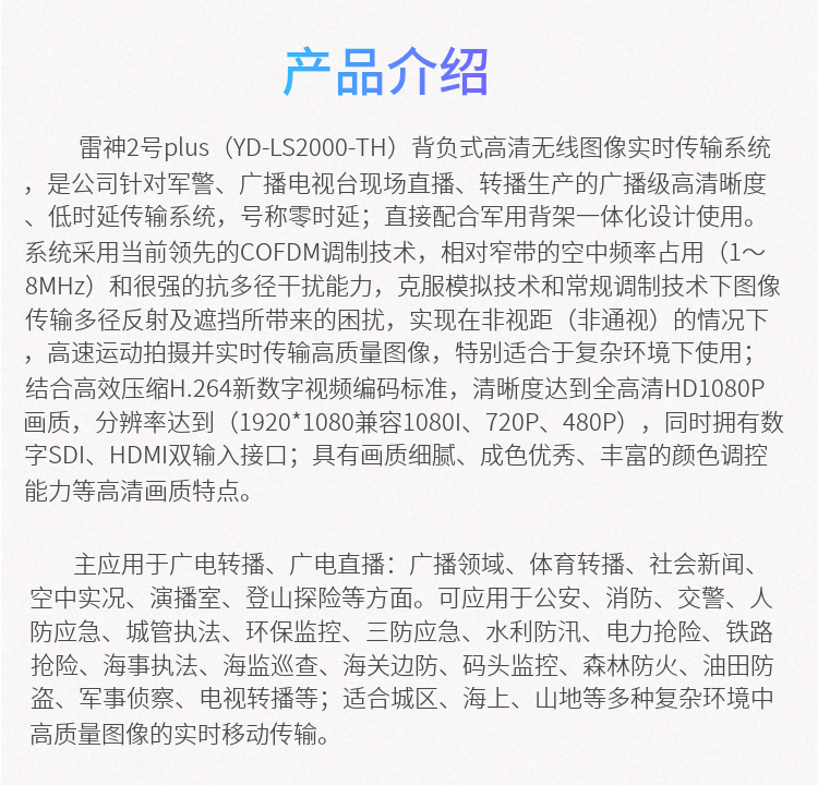 雷神2號plus(YD-LS2000-TH)背負(fù)式高清無線圖像實(shí)時(shí)傳輸系統(tǒng),是公司針對軍警、廣播電視臺現(xiàn)場直播、轉(zhuǎn)播生產(chǎn)的廣播級高清晰度、低時(shí)延傳輸系統(tǒng),號稱零時(shí)延;直接配合軍用背架一體化設(shè)計(jì)使用。系統(tǒng)采用當(dāng)前領(lǐng)先的COFDM調(diào)制技術(shù),相對窄帶的空中頻率占用(1~8MHz)和很強(qiáng)的抗多徑干擾能力,克服模擬技術(shù)和常規(guī)調(diào)制技術(shù)下圖像傳輸多徑反射及遮擋所帶來的困擾,實(shí)現(xiàn)在非視距(非通視)的情況下,高速運(yùn)動拍攝并實(shí)時(shí)傳輸高質(zhì)量圖像,特別適合于復(fù)雜環(huán)境下使用;結(jié)合高效壓縮H.264新數(shù)字視頻編碼標(biāo)準(zhǔn),清晰度達(dá)到全高清HD1080P畫質(zhì),分辨率達(dá)到(1920*1080兼容1080I、720P、480P),同時(shí)擁有數(shù)字SDI、HDMI雙輸入接口;具有畫質(zhì)細(xì)膩、成色優(yōu)秀、豐富的顏色調(diào)控能力等高清畫質(zhì)特點(diǎn)。