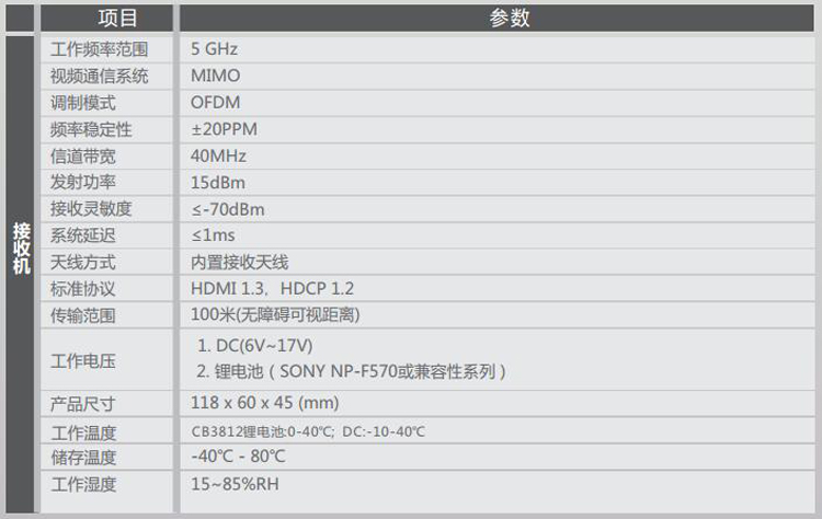 100米HDMI無線高清視頻傳輸器 HDMI 100米無線傳輸器 拍電影專用 適用攝像機、照相機等帶有HDMI輸出的便攜高清視頻設備; -支持DC供電(電源適配器12V、寬電壓范圍的應急電源(6V~17V)或安裝鋰電池 (SONY NP-F570/F750/Canon LP-E6+及兼容系列電池)供電,內部有防止電源范姐的保護設計; -正面結構為鋰電池卡座,用來安裝SONY。 隨著高清影視設備越來越廣泛的應用,其布線過程中也出現了多方面的問題,如線材成本較高,使用壽命短,如果現場保護不夠,路過人群的踩踏可能影響線材表現,甚至引發直播事故。本方案為影視直播場景提供了更加便捷安全的解決方案,其遠距離傳輸多頻點支持配合大容量鋰電池系統,即插即用設置,能充分的滿足各種室內外拍攝需求,尤其是免布線的特點,將帶給您更安全,更便利的專業體驗。
