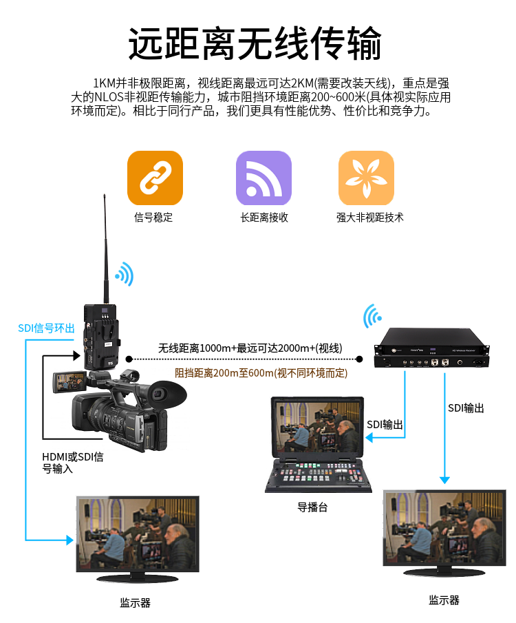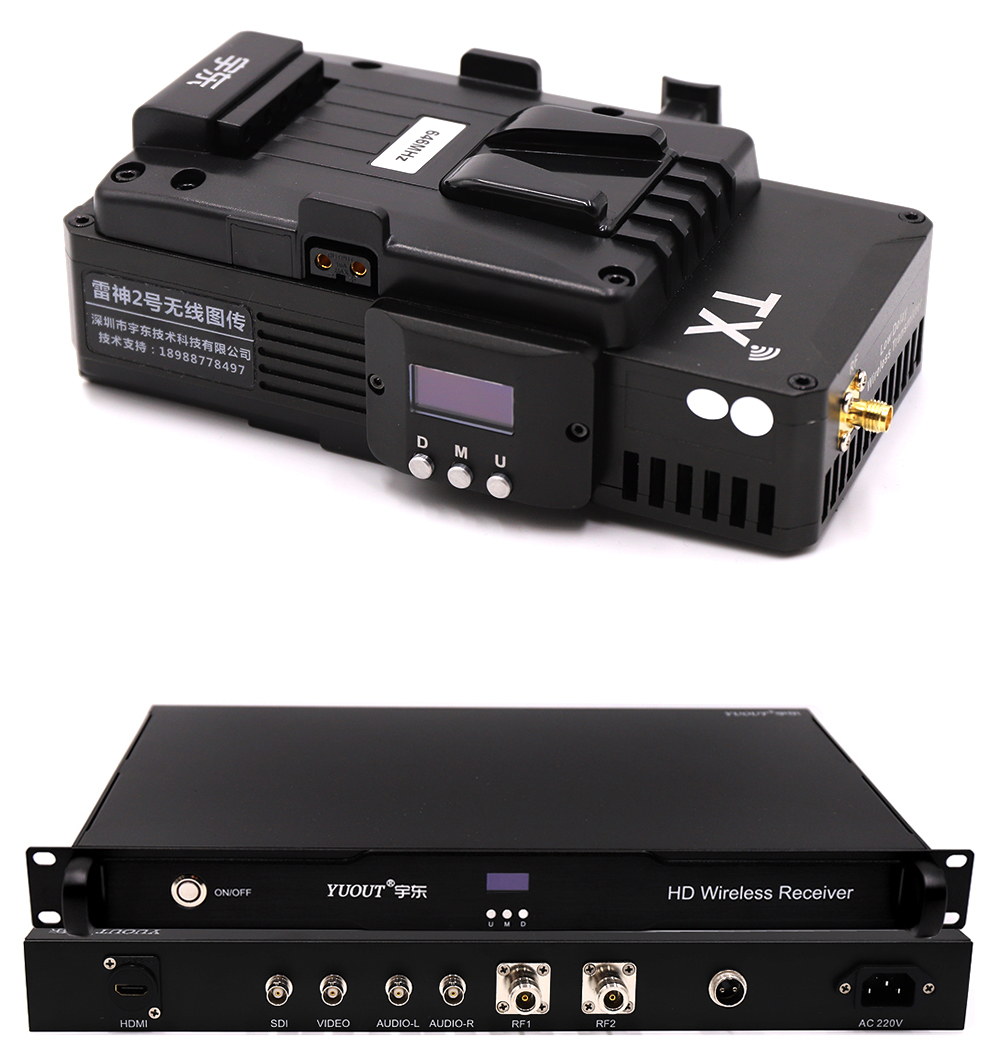 THOR 2 wireless image transmission double V button switch radio and television broadcast wireless video transmission system, non-line-of-sight (complex environment, can go through the wall, many people, cars, trees and obstacles), Hd wireless image real-time transmission system is mainly used in radio and television stations, film and television shooting, live education, large-scale concerts, film and television production, sports broadcasting, social news, air live, studio, public security, fire, maritime, traffic police, civil air defense emergency, urban management law enforcement, three defense emergency and other aspects. Appearance and function can be customized, ground visual distance: 1 ~ 2 km; Non-visual distance: 200 ~ 600 meters. Depending on the actual application environment, you can choose HDMI input or SDI input, SDI output, etc.