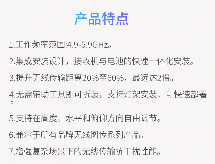 1. 工作頻率范圍:4.9-5.9GHz 2. 集成安裝設(shè)計(jì),實(shí)現(xiàn)與接收機(jī)與電池的快速一體化安裝 3. 無(wú)需輔助工具即可拆裝,支持燈架安裝,可快速部署 4. 支持在高度、水平和俯仰方向自由調(diào)節(jié), 5. 適用于所有品牌無(wú)線(xiàn)圖傳全系列產(chǎn)品 6. 增強(qiáng)復(fù)雜場(chǎng)景下的無(wú)線(xiàn)傳輸抗干擾性能 7. 提升無(wú)線(xiàn)傳輸距離最遠(yuǎn)達(dá)2倍