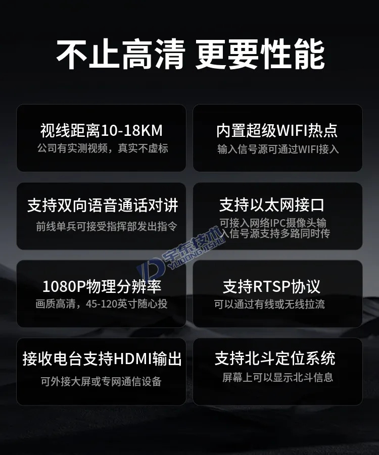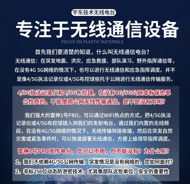 宇東技術(shù)雷神1號PRO背負(fù)式高清無線圖傳電臺,是公司針對應(yīng)急救援指揮、公安、反恐作戰(zhàn)、消防救援、邊防執(zhí)勤、海警海關(guān)巡檢、部隊拉練演習(xí)、森林消防等,在突發(fā)重大事件,斷網(wǎng)斷電,通信中斷的情況下,現(xiàn)場工作人員通過雷神1號PRO背負(fù)式高清無線圖傳電臺,把現(xiàn)場采集的數(shù)據(jù)實時無線傳輸?shù)街笓]車/臨時指揮部大屏幕,讓指揮部領(lǐng)導(dǎo)對現(xiàn)場情況一目了然,節(jié)省了到達(dá)現(xiàn)場的時間,可快速做緊急指揮調(diào)度,最大限度的減少突發(fā)事件帶來的各種損失,雷神2號plus單兵電臺支持雙向語音對講系統(tǒng),現(xiàn)場工作人員可以和指揮部通話,接受領(lǐng)導(dǎo)發(fā)送的各種指令。